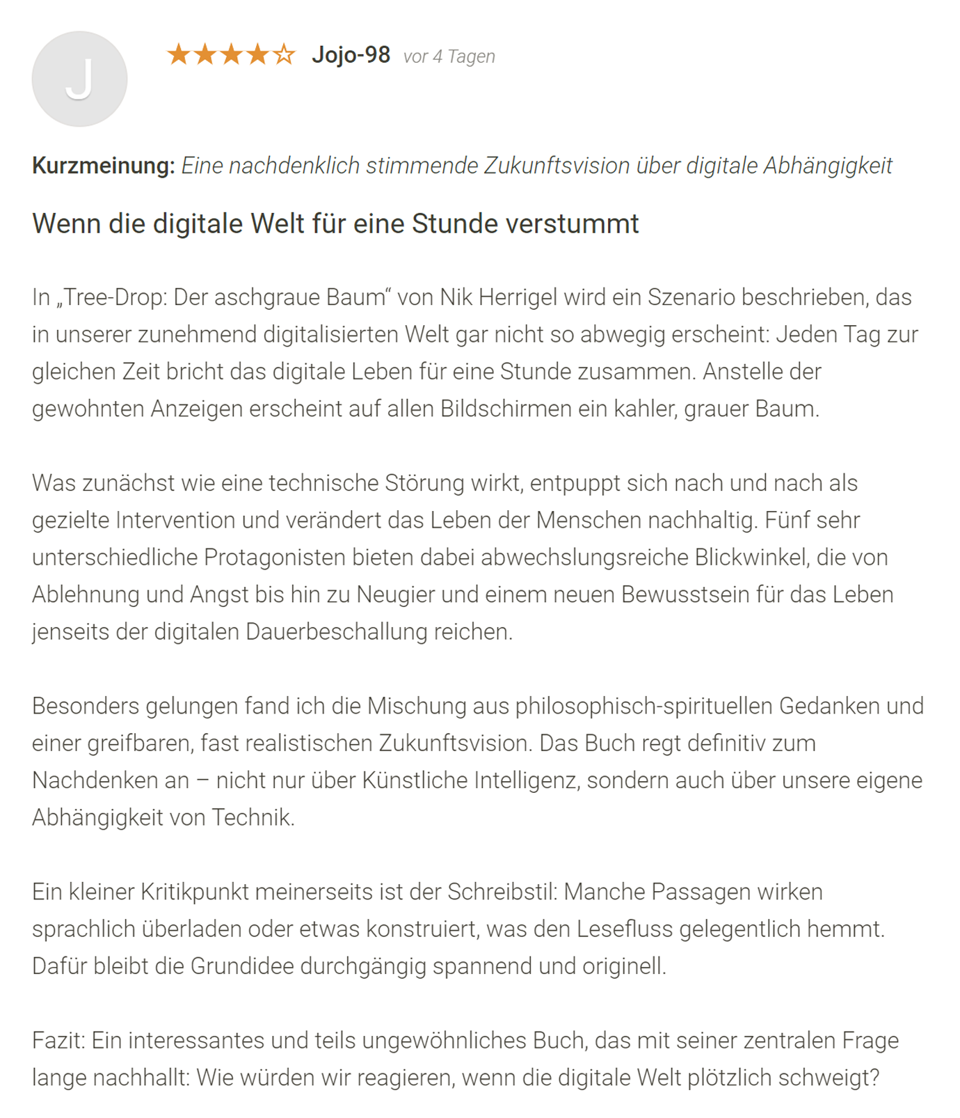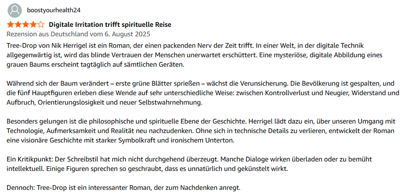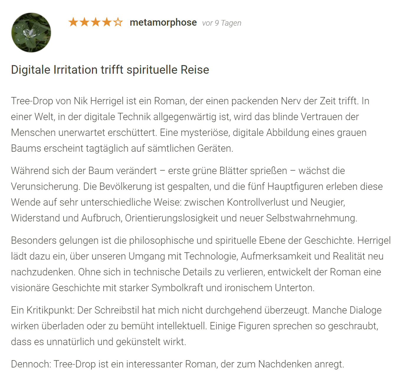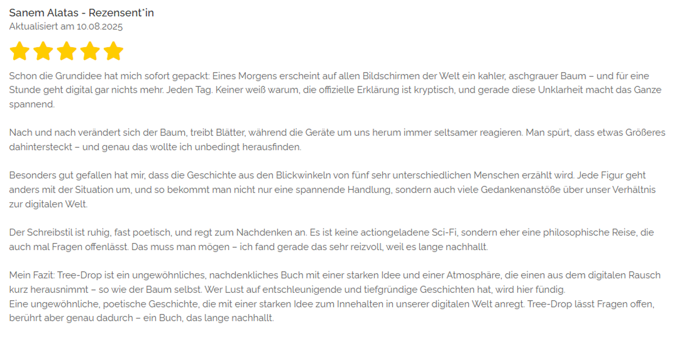 Ohne sich in ausufernden technischen Details zu verlieren, schildert „Tree-Drop“ eine philosophisch-spirituelle Zukunftsvision voller Tiefgang, Ironie und Hoffnung. Eine Einladung, über den eigenen Umgang mit digitaler Technik nachzudenken und die Realität wieder mit allen Sinnen zu erfahren – bevor es zu spät ist.