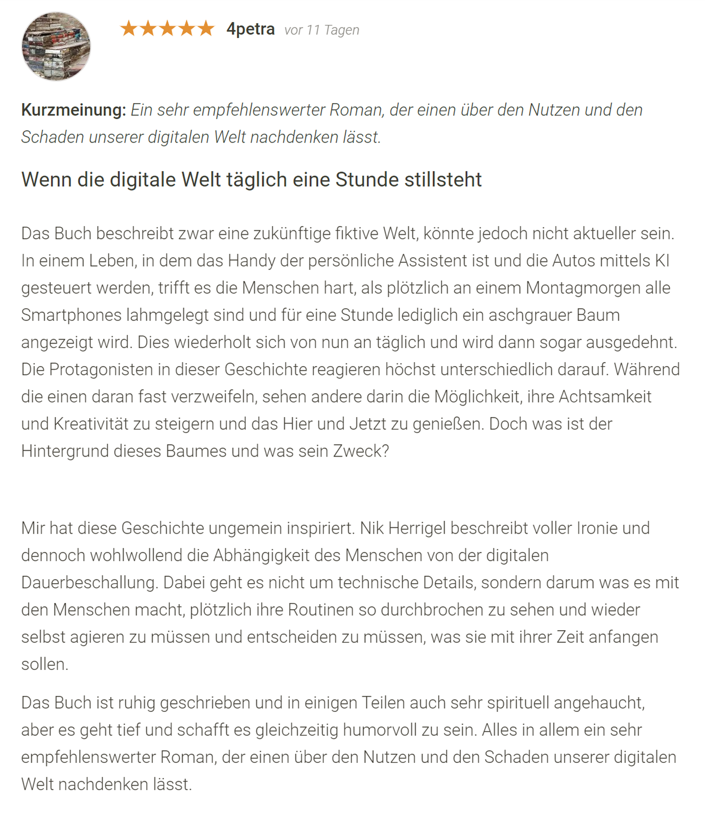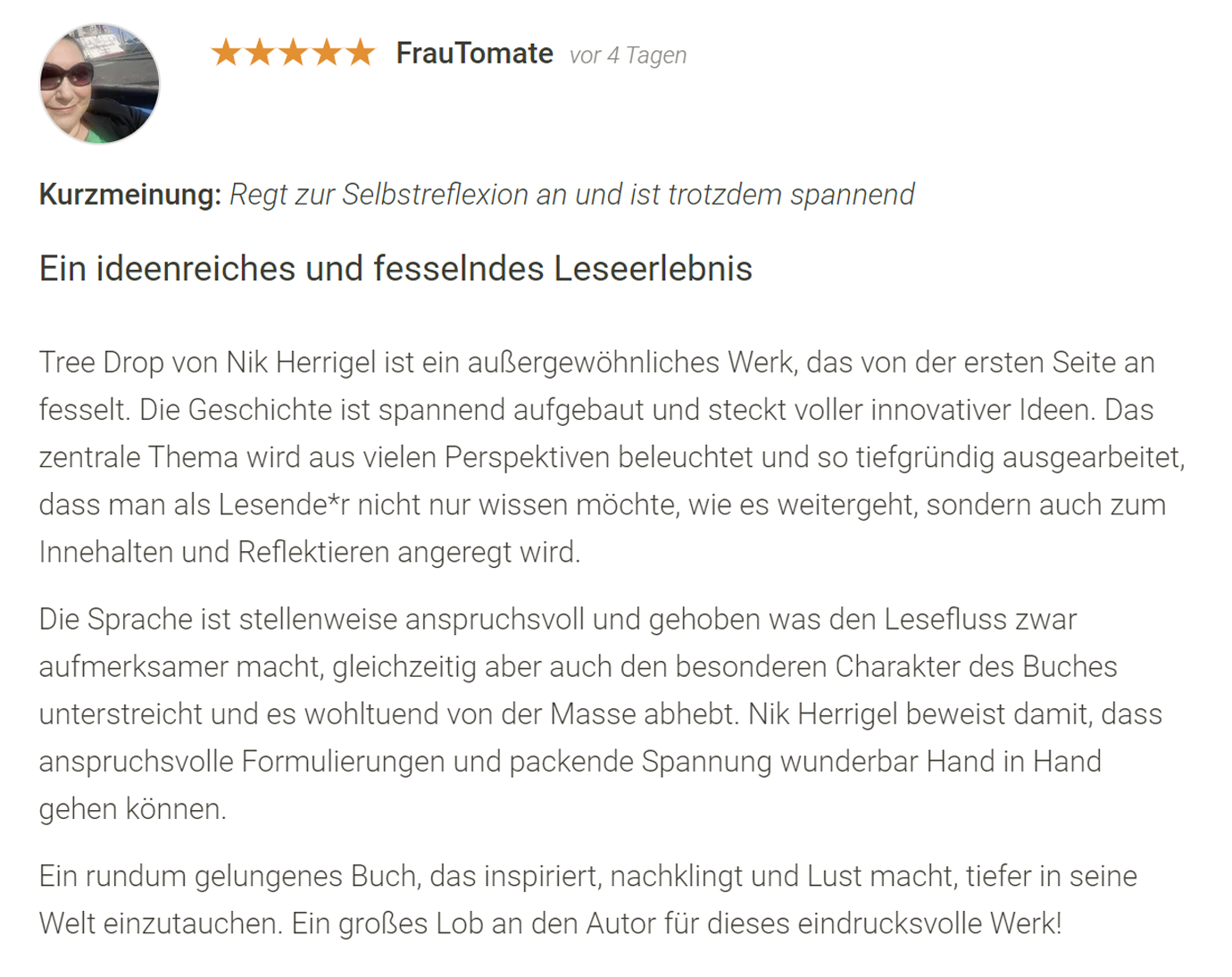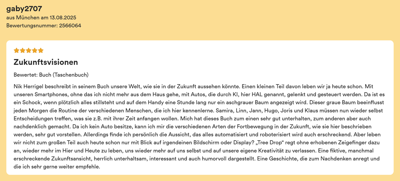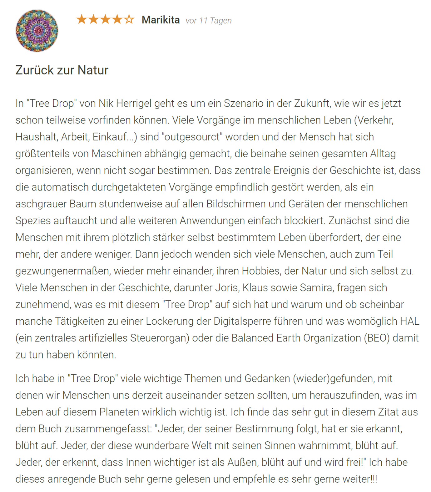 Ohne sich in ausufernden technischen Details zu verlieren, schildert „Tree-Drop“ eine philosophisch-spirituelle Zukunftsvision voller Tiefgang, Ironie und Hoffnung. Eine Einladung, über den eigenen Umgang mit digitaler Technik nachzudenken und die Realität wieder mit allen Sinnen zu erfahren – bevor es zu spät ist.