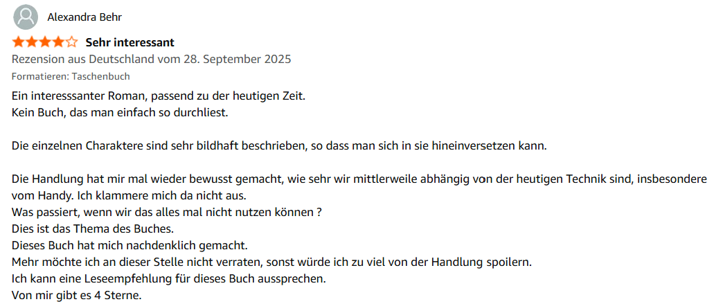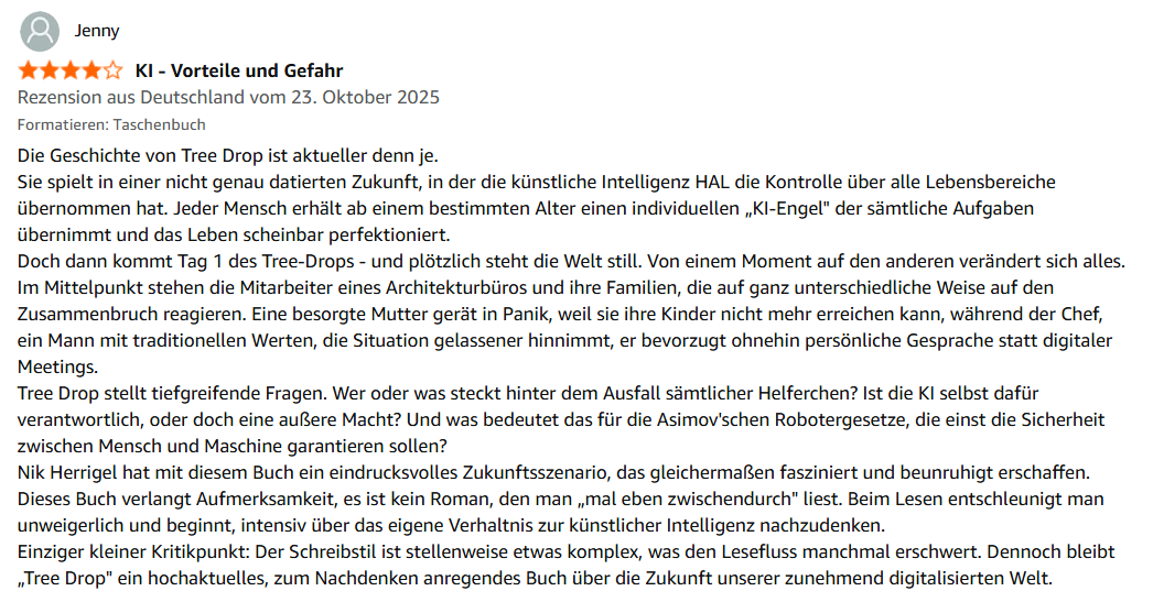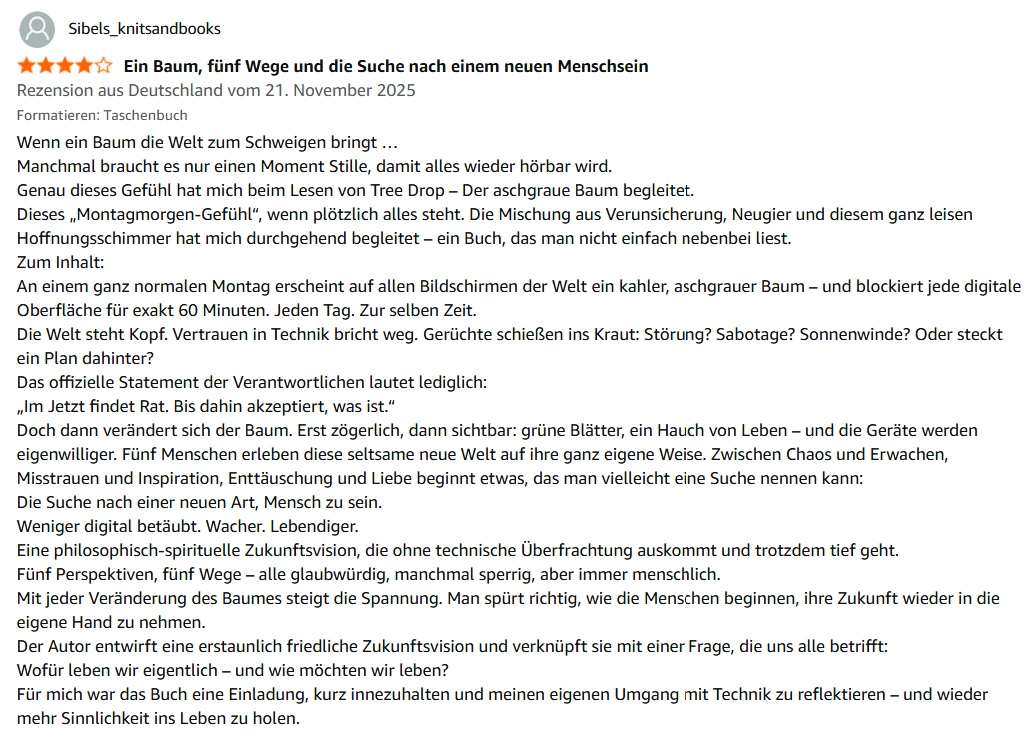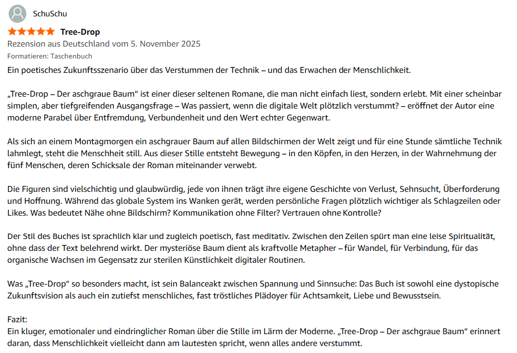 „Tree-Drop – Der aschgraue Baum“ verbindet visionäre Science Fiction mit spiritueller Tiefe und philosophischen Fragen. Der Roman regt zum Nachdenken an und bietet zugleich eine spannende Geschichte über Mut, Liebe und die Rückkehr zu Achtsamkeit.